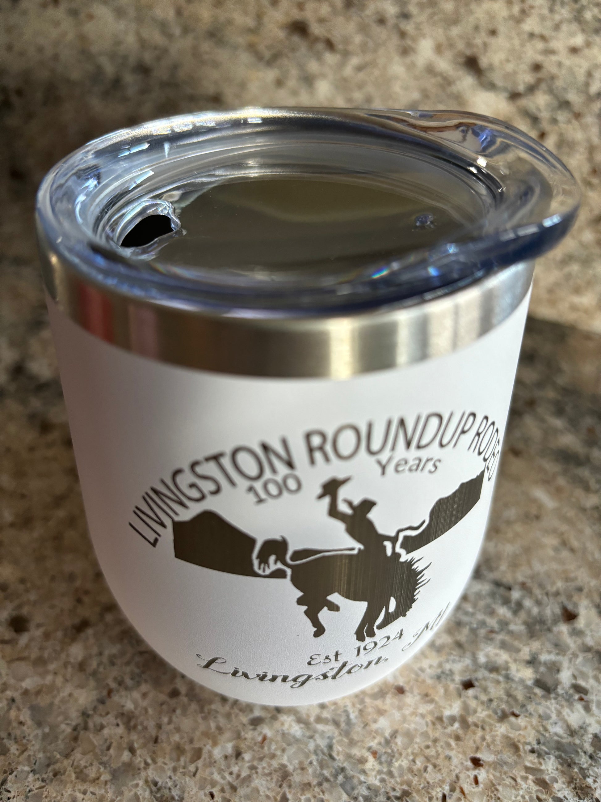 Insulated wine glass with lid. Livingston Roundup 100th Anniversary logo is laser engraved on the wine tumbler.